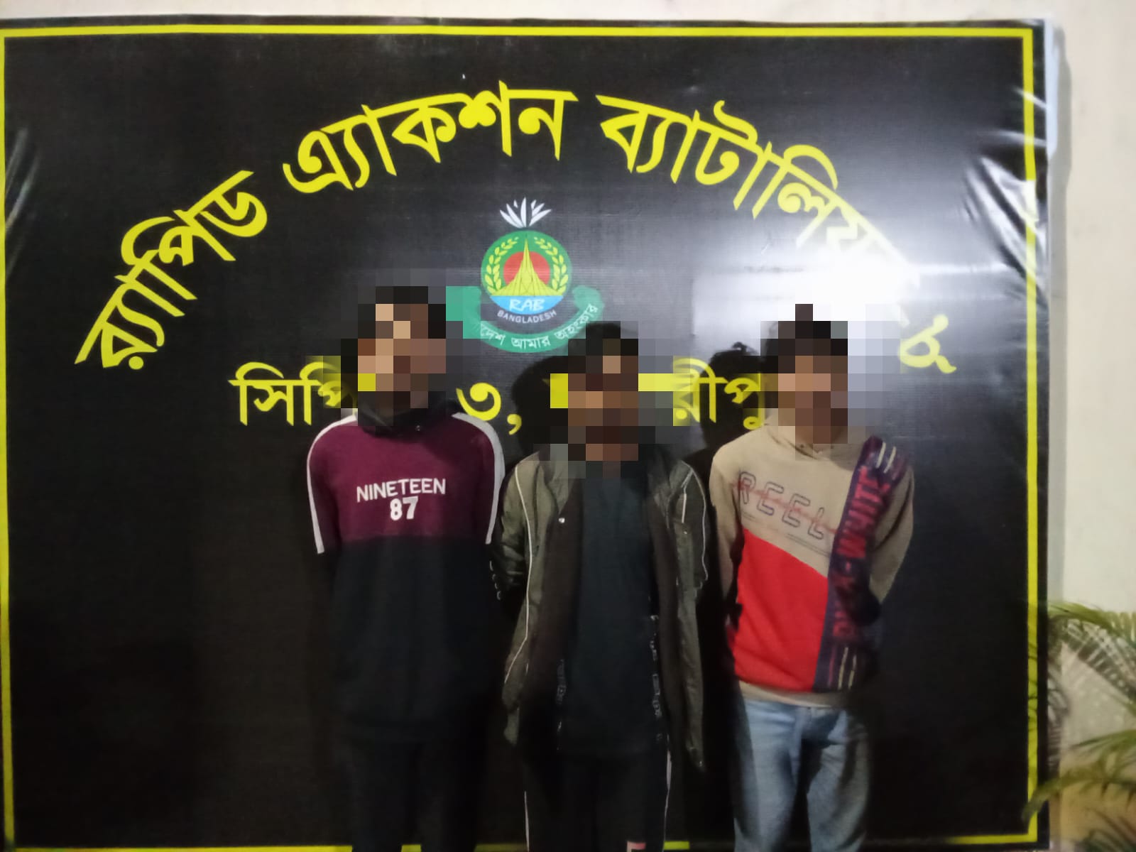 রোববার (৪ জানুয়ারি) সন্ধ্যায় মাদারীপুর র‌্যাব-৮ ক্যাম্পে এক সংবাদ সম্মেলনের মাধ্যমে বিষয়টি নিশ্চিত করেন র‌্যাব-৮ এর অধিনায়ক কমান্ডার শাহাদাত হোসেন। এর আগে শনিবার মধ্যরাতে তাদের কিশোরগঞ্জের পূর্ব পৈলানপুরের বাজিতপুর এলাকা থেকে গ্রেফতার করা হয়। গ্রেফতারকৃতরা হলেন, শরিয়তপুরের ডামুড্যা উপজেলার কনেশ্বর এলাকার বাবুল খানের ছেলে সোহাগ খান (২৭) ও একই এলাকার সামসুদ্দিন মোল্লার ছেলে রাব্বি মোল্লা (২১) ও শহীদ সরদারের ছেলে পলাশ সরদার (২৫)।
