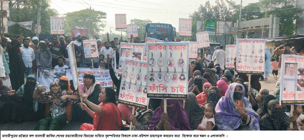মাদারীপুরের রাজৈরে ব্যবসায়ী জাকির শেখের হত্যাকারীদের বিচারের দাবিতে ঢাকা-বরিশাল মহাসড়কের রাজৈর বাসস্ট্যান্ডে টায়ার জ্বালিয়ে বিক্ষোভ করেছে স্বজন ও এলাকাবাসী । বৃহষ্পতিবার বিকাল ৪ টায় রাজৈর বাসষ্টান্ডে এ কর্মসূচী পালিত হয়। মহাসড়ক অবরোধের কারনে উভয়পাশে দীর্ঘ যানজনের সৃষ্টি হয়। পরে রাজৈর থানা পুলিশ এসে অবরোধ সরিয়ে যান চলাচল স্বাভাবিক করে। জাকির শেখ হত্যার ঘটনায় তার স্ত্রী বাদী হয়ে রাজৈর থানায় হত্যা মামলা দায়ের করেছিল। সেই মামলার ১ নং আসামী ইলিয়াস খানসহ ৪ জনকে বুধবার রাতে গাজীপুর ও মুন্সীগঞ্জ এলাকায় অভিযান চালিয়ে গ্রেফতার করেছে র্যাব-৮