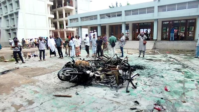 ফরিদপুর-৪ আসন থেকে ভাঙ্গা উপজেলার আলগী ও হামেরদী ইউনিয়ন কর্তনের প্রতিবাদে সোমবার (১৫ সেপ্টেম্বর) তৃতীয় দফার লাগাতার অবরোধের দ্বিতীয় দিনে উত্তপ্ত হয়ে ওঠে ভাঙ্গা পৌরসভা ও আশপাশের এলাকা। দিনভর বিক্ষোভ, ভাঙচুর ও অগ্নিসংযোগে উত্তাল ছিল পুরো এলাকা। ভাঙ্গা থানা ও হাইওয়ে থানা, উপজেলা পরিষদ ও কর্মকর্তাদের অফিসে হামলা চালায় বিক্ষুব্ধ জনতা।