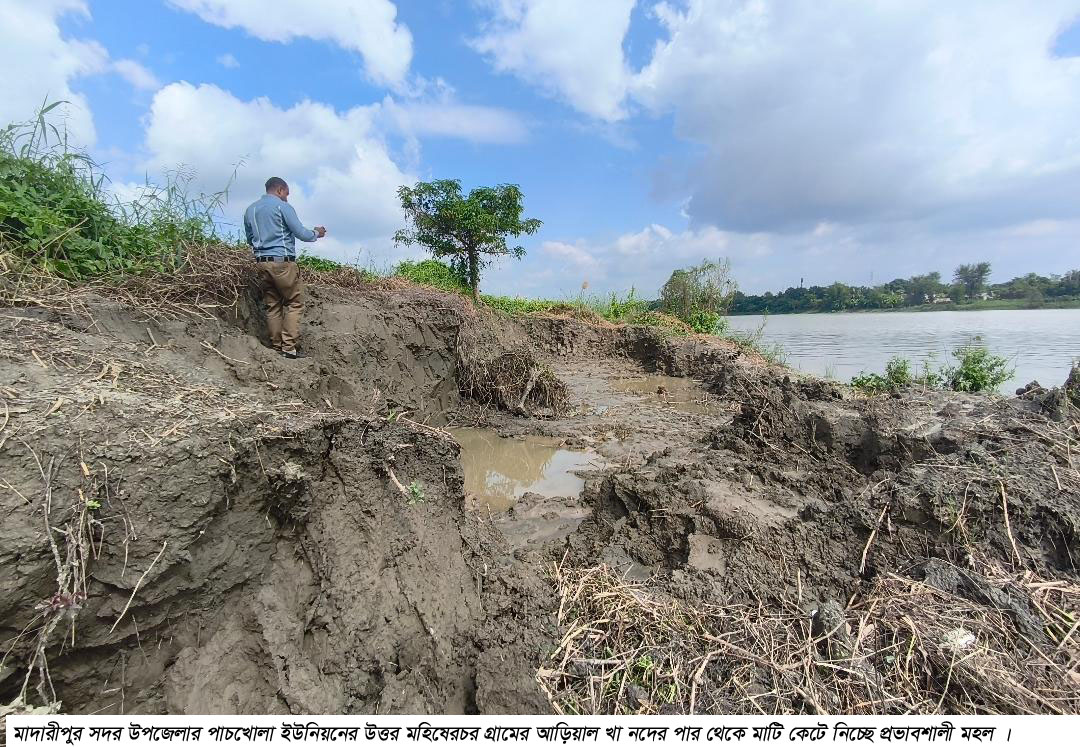 সরেজমিনে গিয়ে দেয়া যায়, মাদারীপুর সদর উপজেলার পাচখোলা ইউনিয়নের উত্তর মহিষেরচর গ্রামের আড়িয়াল খা নদের পার থেকে স্থানীয় আবু চৌকিদারের ছেলে ইলিয়াজ চৌকিদার তার নিজস্ব লোকজন নিয়ে রাতের আধারে আবার কখনও ভোর ৫ টা থেকে সকাল ৮ পর্যন্ত মাটি কেটে ট্রলারে করে নৌপথেই সেই মাটি নিয়ে যাচ্ছে। প্রথমে তার নিজস্ব জমি থেকে মাটি কাটলেও পরবর্তীতে স্থানীয় মো. খলিল চৌকিদার, মো. বাবুল চৌকিদারের জমি থেকেও মাটি কাটা হয়েছে। তারা ইলিয়াজ চৌকিদারকে মাটি কাটতে না বলেও তা শোননি। এদিকে নদের পাড়ে মাটি কেটে গর্ত হবার কারণে পাশেই কাদের সরদারের লাউ, লাল শাখ, টমেটো, করোল্লাসহ তার সবজির বাগান ঝুকির মধ্যে রয়েছে। এছাড়াও পাশেই মিন্টু সরদারের বসতবাড়িটিতে হুমকির মধ্যে আছে। এখনই মাটি কাটা বন্ধ না হলে পুরো গ্রামটি নদীভাঙ্গণের ঝুঁকির মধ্যে পড়বে।